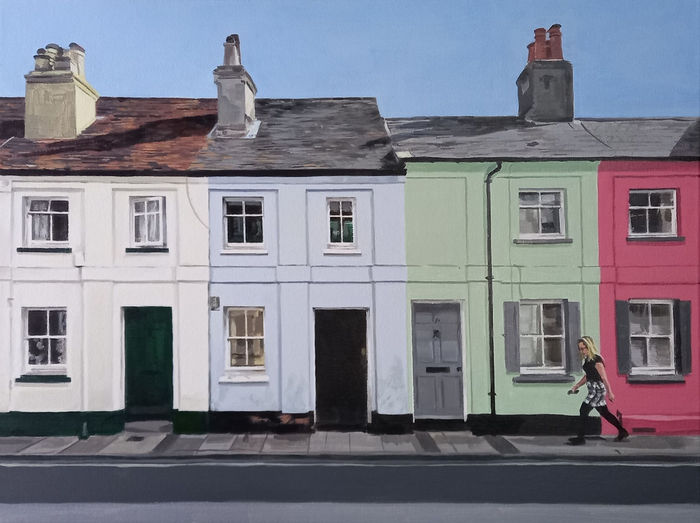 I was drawn to these colourful houses in my hometown and love how the chimneys cast long shadowsAcrylic on deep edge canvas60cm x 45cmUnframed